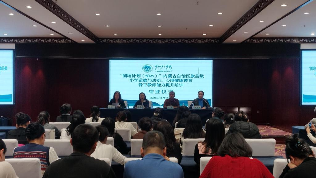 11月15日上午,“国培计划(2025)”内蒙古自治区旗县级小学道德与法治、心理健康教育骨干教师培训班结业仪式顺利举行。贝博继续教育学院院长莎茹莉、海拉尔区教育研修中心副主任毕秀芝、道德与法治教研员王静飞等领导、专家及全体参训教师参加仪式。仪式由贝博继续教育学院副院长汪鑫主持。