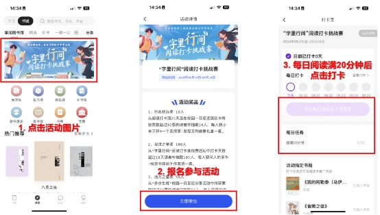 每天阅读满20分钟并点击【打卡】,打卡超过18天有获奖资格(打卡可间断),使用AI朗读、自动翻页不计入活动时长。