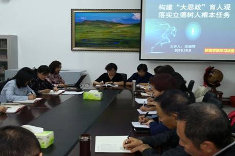 10月9日下午,在崇文楼(B)221,旅游与地理学院开展了学习讲堂专题讲座活动,党总支书记崔丽辉作了题为“构建‘大思政’育人观,落实立德树人根本任务”的专题讲座,全体教职工参加了学习。