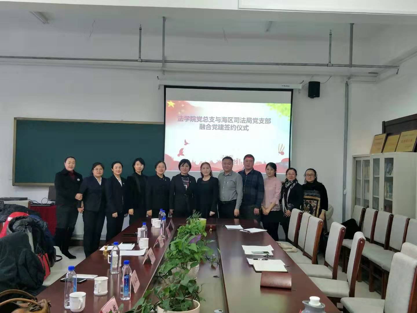 近日,法学院党总支与海区司法局党支部融合党建签约仪式在法学院会议室举行,海拉尔区司法局副局长、党支部副书记吴庭华一行7人,法学院班子成员及党员代表参加了签约仪式,仪式由党总支书记苏杰主持。