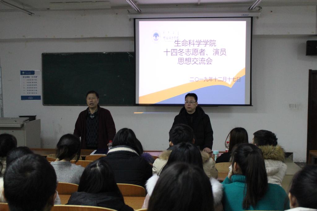12月17日,生命科学学院于科技楼223召开十四冬志愿者、演员思想交流会。生命科学学院党总支书记白国林、党总支副书记张玉桩参加本次会议。