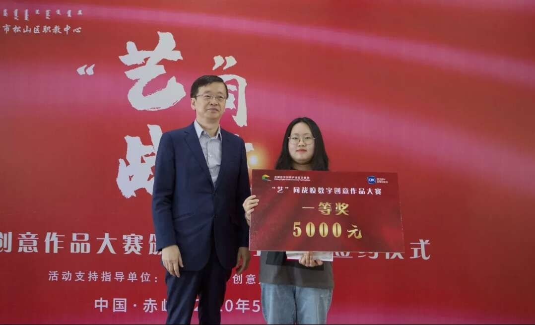 “‘艺’同战役数字创意作品大赛”由北京安快创业谷、赤峰创意产业实训基地主办,旨在引导参赛者通过文艺数字作品创意性地表达抗疫路上的感人瞬间,从而传播社会正能量,激励广大青年崇德向善。大赛历时两个多月,累计收到北京、辽宁、吉林、内蒙古、黑龙江等地390余幅投稿作品。经过线上投票和专家评审,贝博传媒学院2016级数字媒体技术专业董唯佳同学的《齐心抗疫情》获得一等奖。北京大学哲学系博士生导师、北京峰火文化创意中心主任、北京大学文化产业研究院副院长陈少峰教授为其颁奖。
