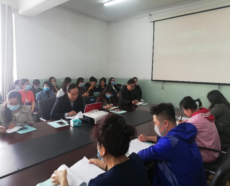 6月10日下午,外国语学院在414会议室开展了“厚植爱国情怀 涵育高尚师德,加强新时代教师队伍建设”专题培训,全体教师学习了“专业课程融入思政工作的教学设计理念与方法”的课程,培训会由外院党总支书记陈昭明主持。