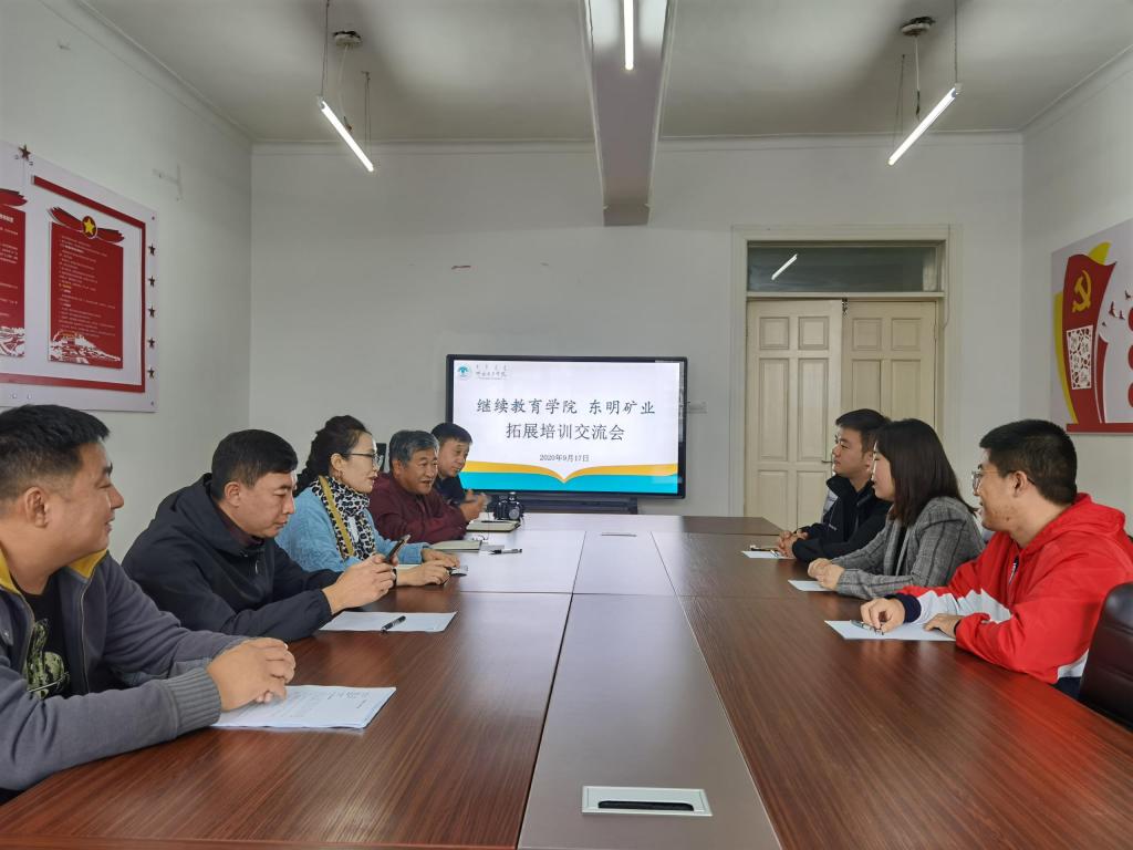 9月17日上午,东明矿业有限公司党政事务部团委一行三人来我院就“团队拓展”项目合作进行交流洽谈,继续教育学院班子、培训科、综合办等部门相关人员参加会议。