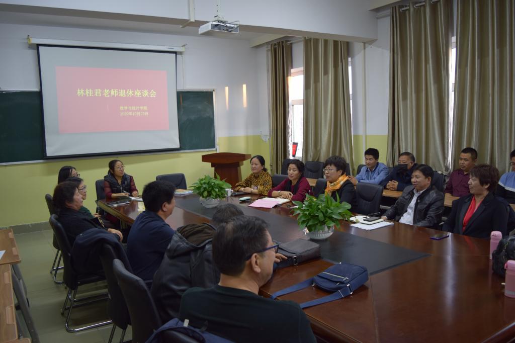 10月28日下午,数学与统计学院全体教师在笃学楼410会议室召开林桂君老师退休座谈会,会议由党总支书记胡旭红主持。