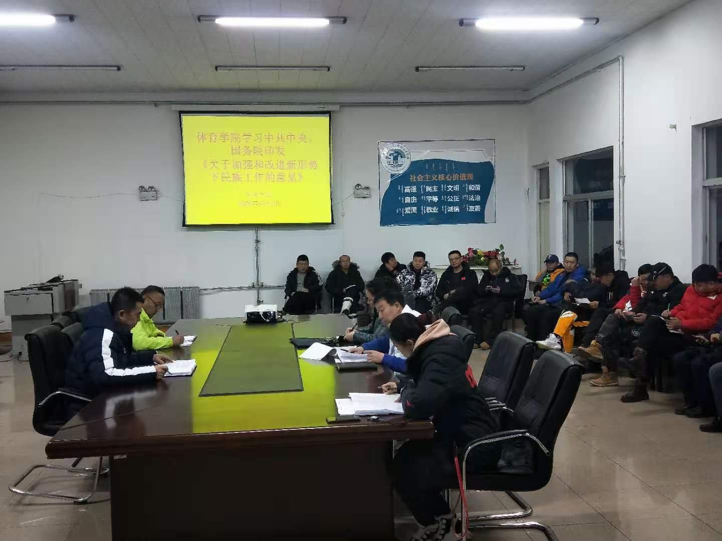 为深入贯彻落实学习关于《习近平总书记民族工作重要论述》的通知精神,12月2日下午,在体育馆三楼会议室,体育学院组织全体教师学习了中共中央国务院印发的关于加强和改进新形势下民族工作的意见,学习由李晓峰院长主持并领学。