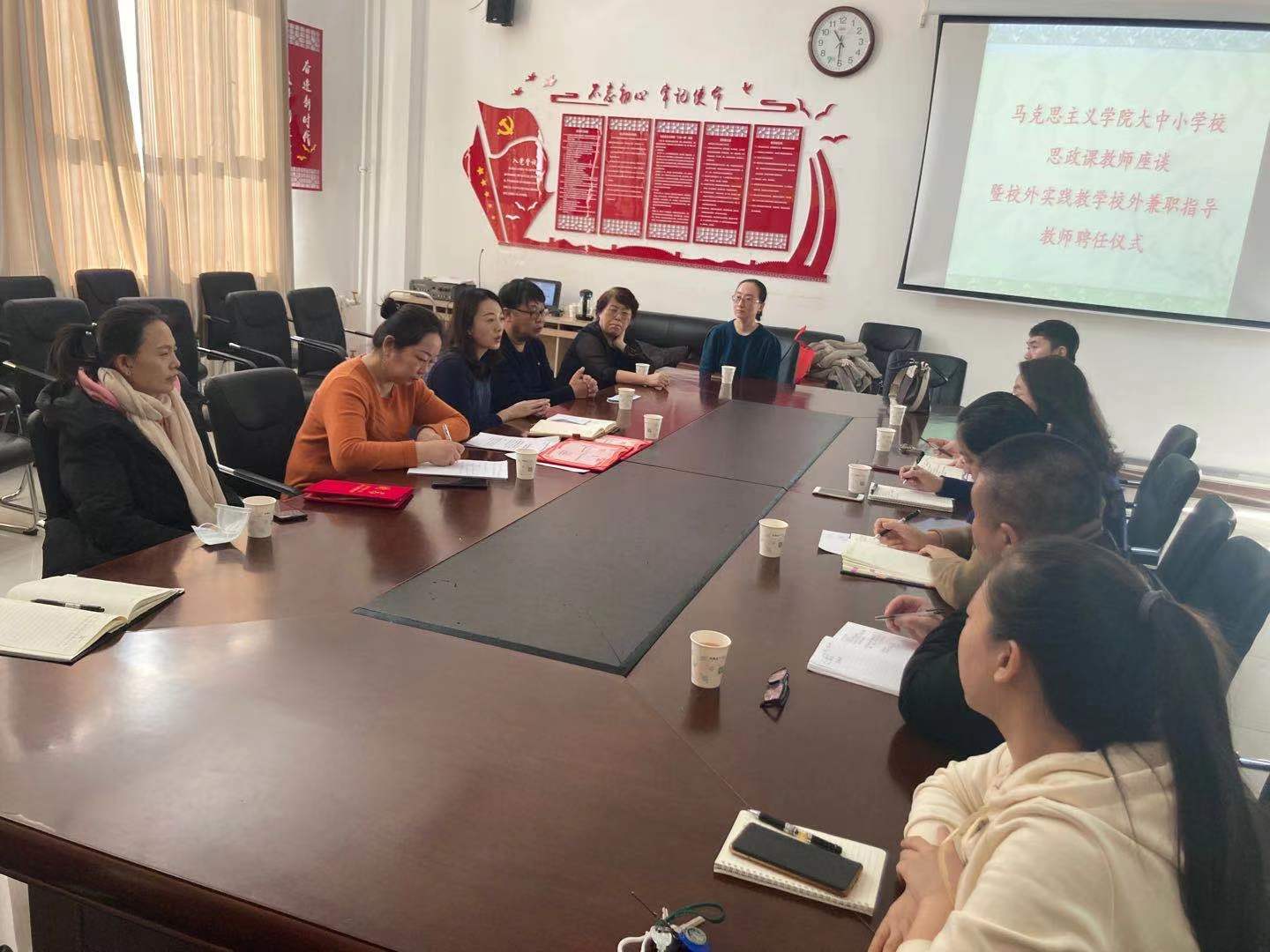 为全面贯彻习近平总书记“318”讲话精神,深入落实中共中央办公厅《关于深入新时代学校思想政治理论课改革创新的若干意见》精神,1月7日,马克思主义学院在崇文楼B123会议室举行大中小学校思政课教师座谈会暨校外实践教学指导教师聘任仪式。海拉尔区第二中学政治组刘传荣老师、海拉尔区第七中学政教主任、政治组高炳杰老师出席了座谈会。