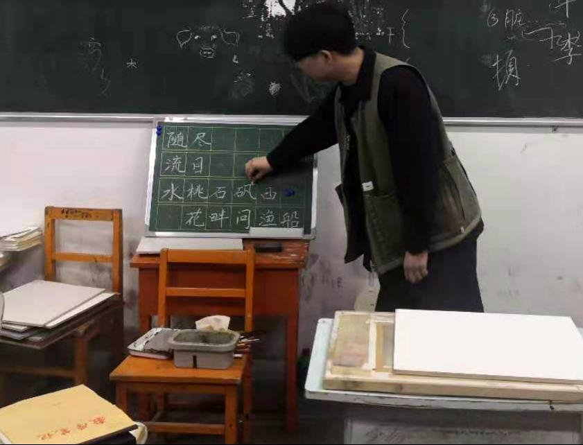 按照教学计划安排,3月5日,美术学院开展师范生技能训练活动。此次训练内容为粉笔字书写技能。学生们自己购买了小黑板、粉笔等学习用具,由书法专业优秀学生担任学习助理辅导师范生的粉笔字学习。