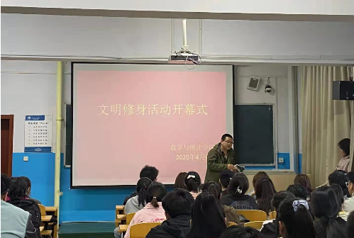 为进一步加强学生思想道德修养、日常行为规范宣传教育,培养学生正确审美观、道德观、行为观,从身边事做起,从自我做起,从小事做起养成良好的文明礼仪习惯,4月9日,数学与统计学院在笃学楼401、413、301、313教师分别开展了“文明修身”承诺践诺活动。全体学生参加活动。