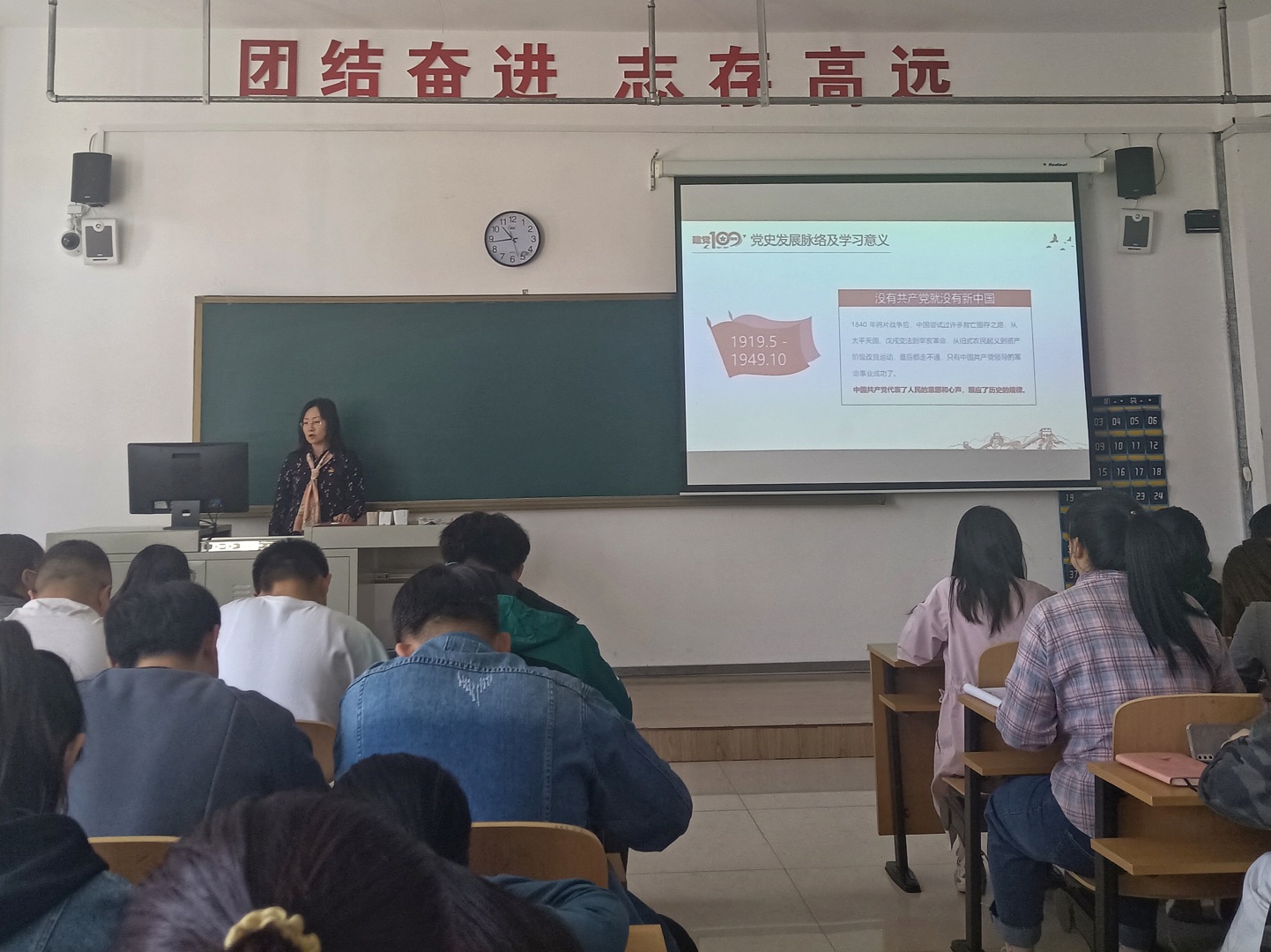 白絮飞副院长结合古往今来中国历史的巨变,为同学们讲解中国党史的发展脉络及学习党史的意义。“百年征程波澜壮阔,百年大党风华正茂。”白絮飞副院长将一块块历史痕迹的碎片清晰的展示给同学,告诉同学们党的百年历程并不是一蹴而就,党的成功是必然的但一定不是容易的。“从1921年开天辟地的中国共产党成立,再到如今‘十四五’时期开启全面建设社会主义现代化国家的新征程,百年峥嵘岁月,党的光辉一直照耀着人民。”白絮飞副院长讲述召开十九次的人民代表大会凸显党的艰辛历程,让同学们更加明白只有中国共产党才能实现中国人民从站起来到富起来再到强起来,同时提到了中国梦及其核心目标“两个一百年”。