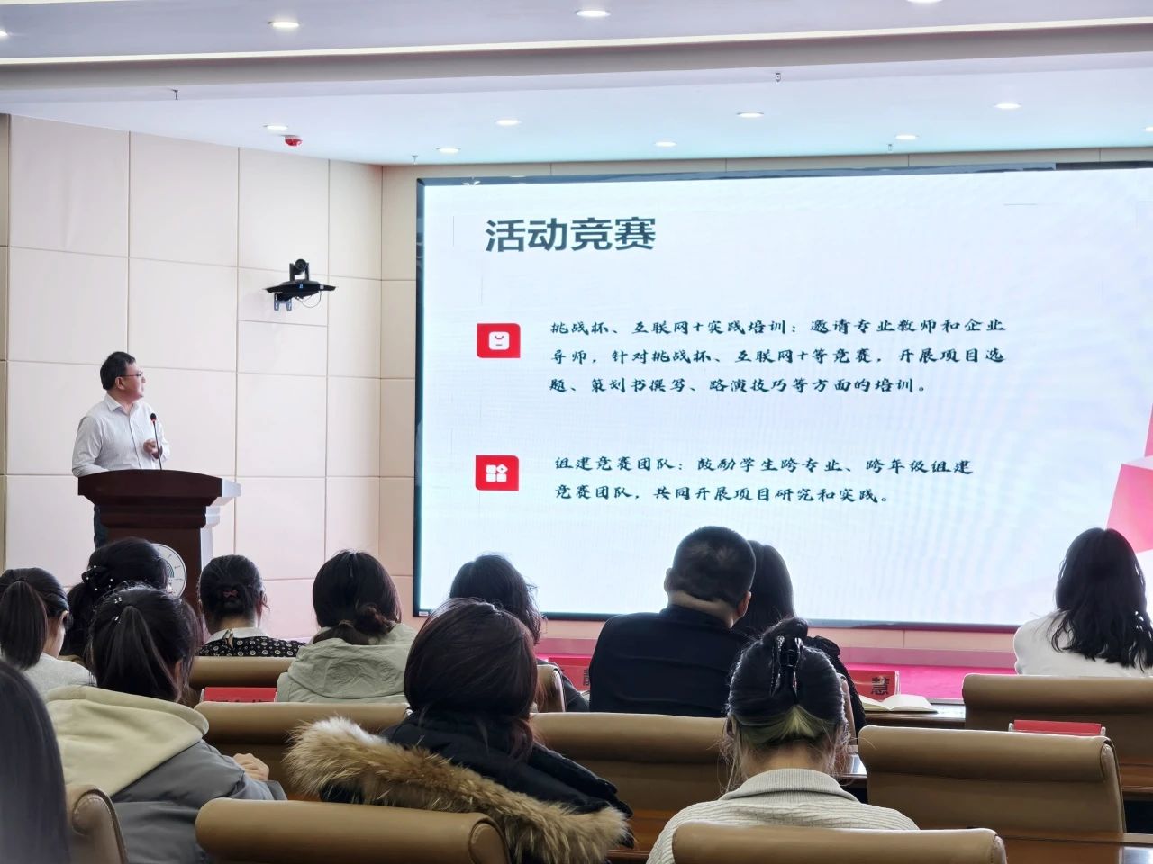在活动发布环节,主持人详细介绍了四大主题月的具体安排,包括“21天学习打卡挑战”“挑战杯实践培训”“五育并举主题活动”“学风监督员”机制等,内容丰富、形式多样。互动环节中,现场师生通过扫描二维码参与“我为评估献一策”线上建议征集,优秀提案实时投屏展示,展现了师生的智慧与创意。