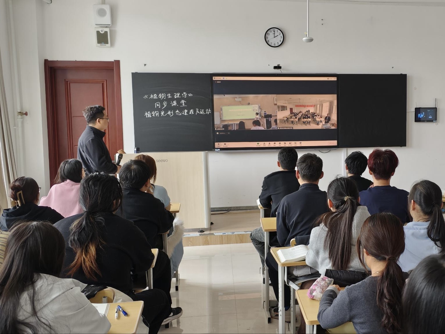 课堂上,王宇珅就本次同步课程内容“植物光形态建成及运动”展开教学,重点讲解了光敏色素、蓝光受体和紫外光受体三种光受体以及植物的向性运动和感性运动的相关内容。在授课过程中,两校师生实时互动,共同探讨专业知识,充分展现了信息技术与教育教学深度融合的成效,实现了两校师生同上一堂课的目标。