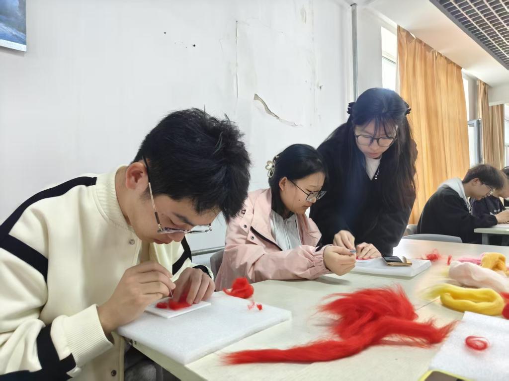 活动中,赵雪莲凭借丰富的艺术教育经验与对非遗技艺的深刻理解,从羊毛毡的历史文化、基础技法讲起,逐步引导同学们将情绪与创意注入作品。活动以“美育浸润”为核心,利用羊毛毡制作过程中重复性的戳刺动作,帮助同学们缓解焦虑、专注当下,将抽象情绪转化为具象作品,实现情感的自由表达。同时,活动巧妙融入传统团花纹样、北疆地域文化等元素,帮助同学们在创作中唤醒审美感知,厚植文化自信。