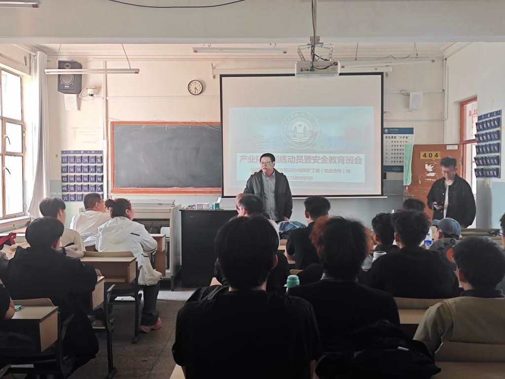 为确保2024级采矿工程(校企合作)专业订单班产业拓展训练安全有序开展,深化产教融合育人成效,9月9日,矿业与化学化工学院在工程楼404教室召开产业拓展训练动员会暨安全教育班会。学院党委副书记敖岩辉,跟训教师褚建伟、韩旭,辅导员庞明慧及2024级采矿工程(校企合作)专业订单班全体30名学生参会,会议由辅导员庞明慧主持。