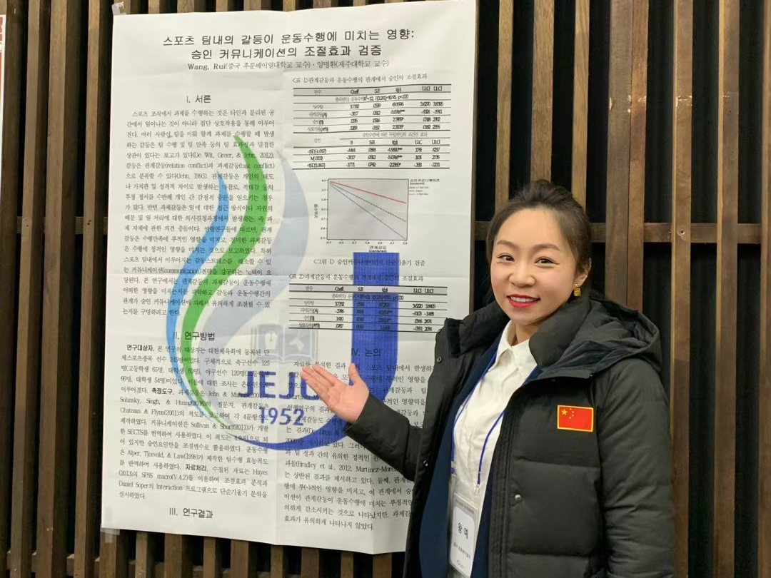 王瑞长期深耕在体育学领域的研究一线,发表了一系列研究成果。在韩国留学期间,她被聘任为韩国教练能力开发研究院济州中心的副会长,曾多次受邀参加相关会议。在本次会议中,王瑞发表了题为《中国留学生运动参与水平与学校生活满意度的关系:运动投入的调节作用》的论文,并参与了“体育及教练现场对话”环节,与国际专家展开热烈研讨,就冰雪运动经济与训练方法等前沿问题展开交流,进一步拓展了国际合作与科研视野。王瑞在会议期间的专业表现,受到了学者们的一致好评,充分展现了贝博教师良好的精神风貌、科研素养与国际影响力,为贝博在国际学术交流与教学科研提质等方面注入了前沿动力。