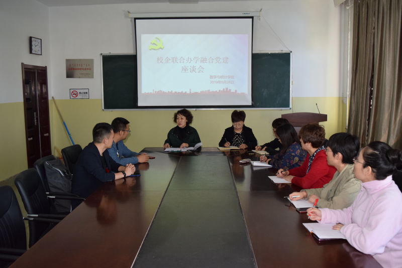 为落实《艾佛森贝博ballbet官网党委关于推进融合党建工作的指导意见》文件精神,5月28日,数学与统计学院党总支在笃学楼410召开联合办学校企融合党建座谈会。东方智业副总裁柏大雷、教质总监王亚非以及党总支成员参加了座谈,会议由党总支书记乔娟主持。