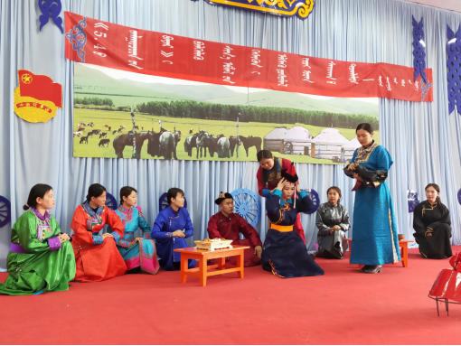 5月10日下午,社会学系2018级班到鄂温克旗锡尼河学校参观教学楼,观摩小学四年级民俗课后,到礼堂对全校师生、家长表演了《蒙古人马具礼仪》、《乌珠穆沁传统婚俗》等表现蒙古族民俗文化的特色节目,受到中小学师生阵阵掌声,加上节目间的民俗知识问答让现场的师生热烈互动。作为回礼锡尼河学校的学生也表演了地方特色的歌舞。