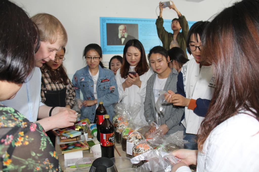 随后阿廖沙、萨尤玛和恩和巴雅尔为在座的师生介绍了俄罗斯传统节日—复活节,并与同学们一起动手制作了复活节彩蛋,品尝了复活节代表食品--圆柱面包和格瓦斯饮料。