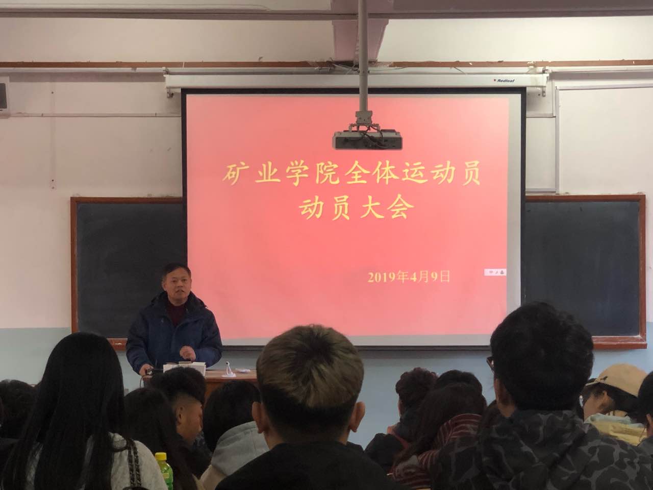 为充分调动矿业学院运动员的积极性,鼓舞选手们的参赛热情,4月9日中午,在知行楼110举行了运动员动员大会,参加本次大会的有党总支副书记王旭,团总支书记汪鑫以及全体运动员、学生会成员。王旭副书记做了动员讲话。