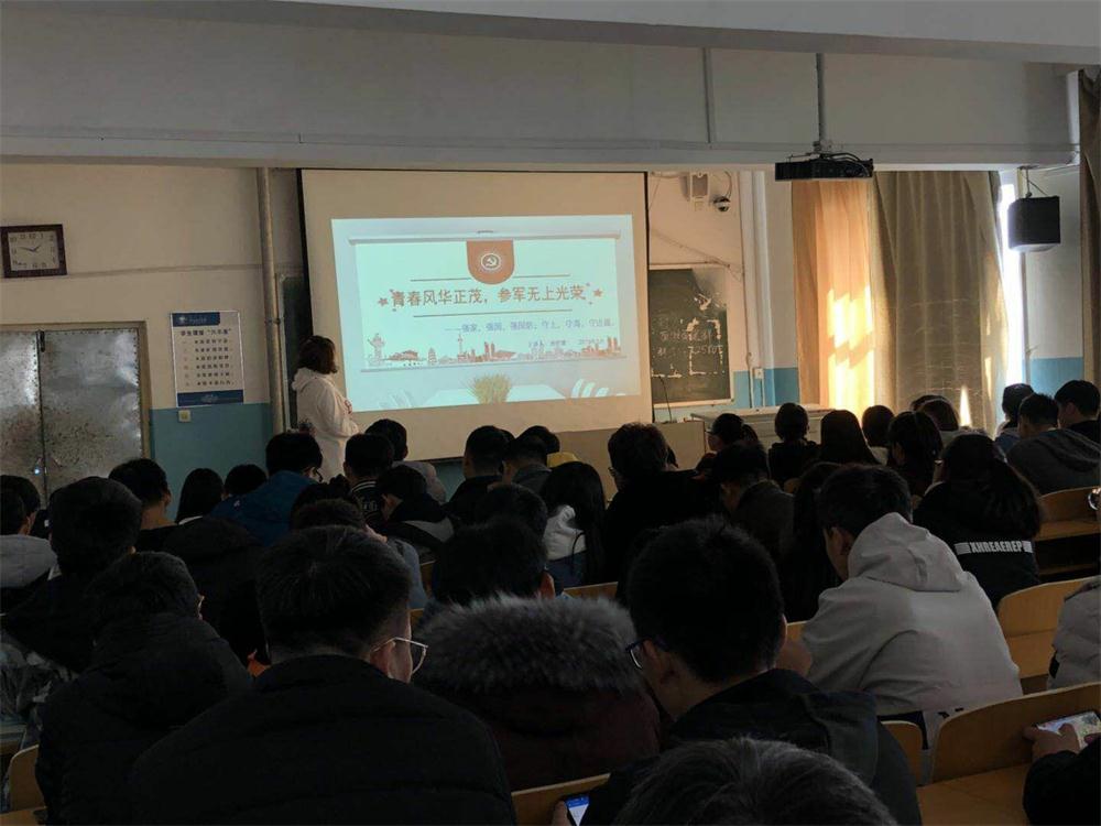 讲座前,首先播放了2019年征兵宣传片,片中我国的超然军力让同学们感到热血沸腾!场景令人无比震撼。随后,庞老师通过PPT放映向同学们详细介绍了当前我国征兵政策,主要包括:征兵对象范围、入伍基本要求、入伍优惠政策以及报名方式和流程等。强调,军队对高素质大学生的需求越来越强烈,而大学生应征入伍也是对自身价值的一种肯定和展示,通过在军营中的磨练可以让大学生更加坚韧和成熟。
