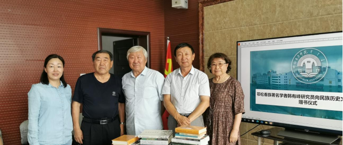 7月13日下午,鄂伦春族著名学者韩有峰教授和孟淑贤女士向民族历史文献研究中心和贝博图书馆少数民族文献研究部捐赠了《鄂伦春语汉语词典》《鄂伦春语·汉语·俄语对照词典》《鄂伦春汉语对照读本》等多部书籍,由文献研究中心主任斯仁巴图教授和图书馆副研究馆员白娜接受了赠送的书籍。