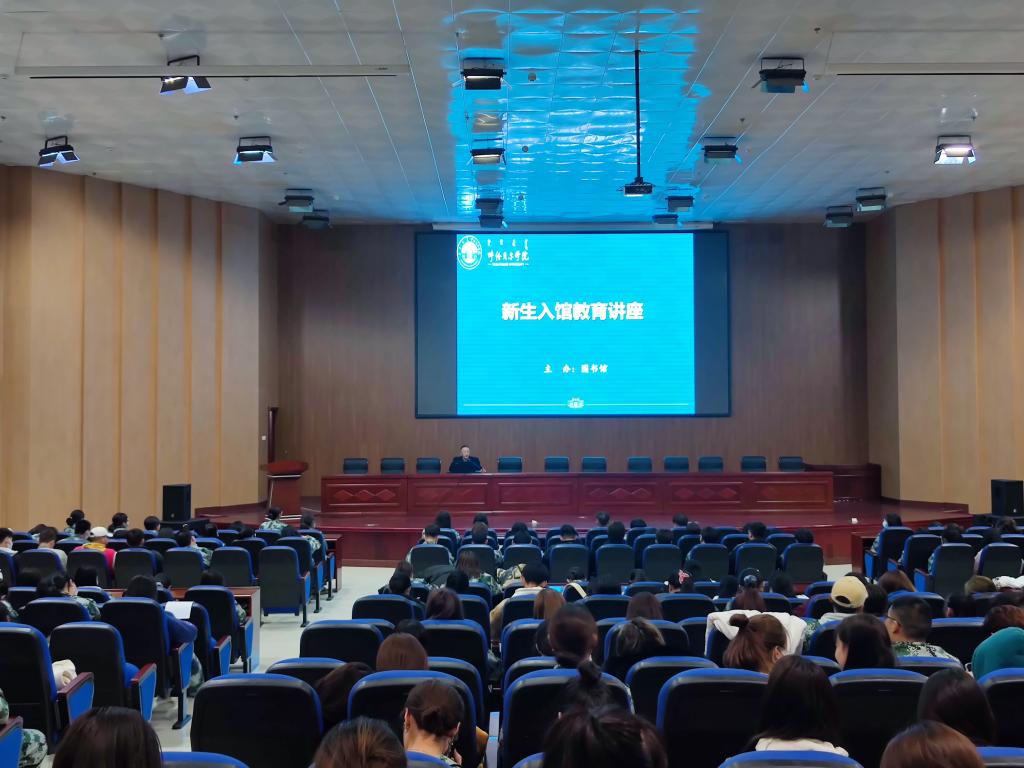 本次新生入馆教育涵盖了学校21个学院的大一新生及预科生,受众学生3700余人。刘建波、赵丹丹老师分别从图书馆概况、智慧图书馆特色服务、文献资源储存、馆藏分布、图书馆学常识、服务指南等方面进行了细致的讲解。