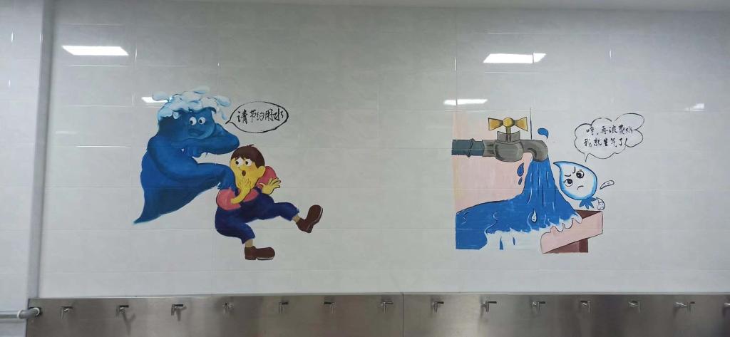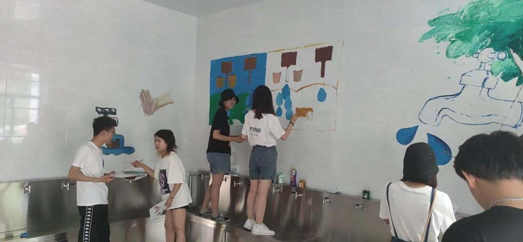 活动开始前,志愿者们认真准备,精心设计每幅草图。经过充分讨论确定后,同学们主要围绕节约用水、保护水资源、爱护环境、网红卡通人物等主题进行创作并按照样图进行实地绘画。活动结束后志愿者们又对水房卫生进行了打扫,用自己的劳动使水房焕然一新。