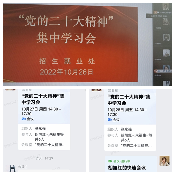 为深入学习领悟党的二十大报告的丰富内涵和精神实质,精准把握报告中提出的一系列新思路、新战略、新举措,促进处级、科级干部先学一步、学深一层,做到有所思、有所悟、有所获,根据学校党委关于组织党员干部学习党的二十大报告和加强处科级干部脱产培训的相关要求,结合部门人员居家办公的工作实际,招生就业处于10月26日至28日,举办了“学习党的二十大精神”线上集体学习会。会议由胡旭红处长主持,部门副科级以上干部参加了学习会。