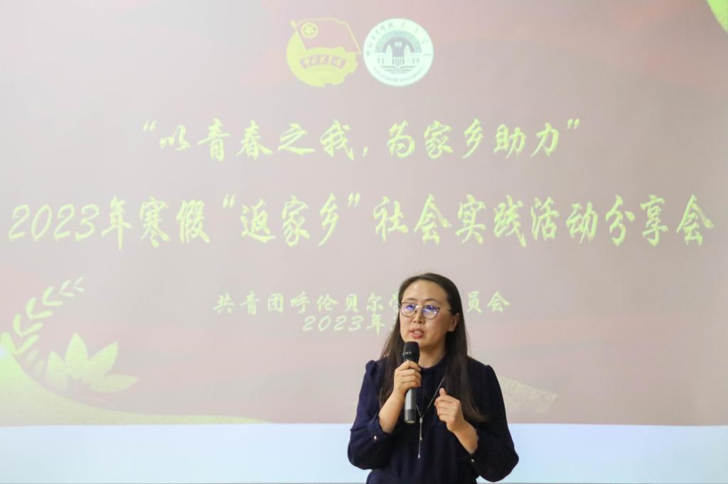 活动伊始,同学们一起观看了贝博学子参加寒假“返家乡”社会实践活动的相关视频,视频结束后,同学们热情澎湃,为分享会的开展营造了良好的氛围。紧接着,12名同学代表依次进行汇报分享。分享人通过精美的PPT激情飞扬地向大家介绍了各自在寒假期间进行的“返家乡”社会实践工作内容、成果,并结合自己本次的实践活动向大家分享了实践感悟,为大家带来了形式多样、精彩纷呈的汇报,充分展现了贝博学子结合自己所学知识为建设美丽家乡而努力奋斗的青春风貌。最后,由校团委副书记格根塔娜进行总结发言。她肯定了大家寒假实践取得的成果,鼓励同学们在“返家乡”社会实践分享会的交流平台中相互学习,提升自身综合素质,并希望未来有更多同学参与到社会实践当中,尽自身所长,展青春风采。