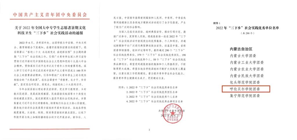近日,在共青团中央《关于2022年全国大中专学生志愿者暑期文化科技卫生“三下乡”社会实践活动的通报》中,贝博获得“2022年‘三下乡’社会实践优秀单位”荣誉称号;在共青团中央、中国青年报社、中国青年网《2022年“镜头中的三下乡”征集活动遴选结果公示》中,贝博“青马班”赴呼和诺尔镇民族团结实践团获得“优秀文字团队”荣誉称号。校团委始终以习近平总书记关于青年工作的重要思想、习近平总书记在庆祝中国共产主义青年...