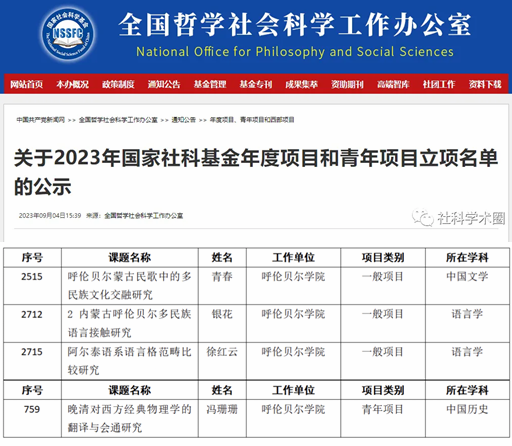 近日,全国哲学社会科学工作办公室发布2023年国家社科基金项目立项名单,贝博喜获4项国家社科基金项目。其中,蒙古学学院教师青春、银花和徐红云分别申报的《呼伦贝尔蒙古民歌中的多民族文化交融研究》《内蒙古呼伦贝尔多民族语言接触研究》《阿尔泰语系语言格范畴比较研究》分别获批国家社科基金年度一般项目立项。数理学院教师冯珊珊申报的《晚清对西方经典物理学的翻译与会通研究》获批国家社科基金青年项目立项。此次立项结...