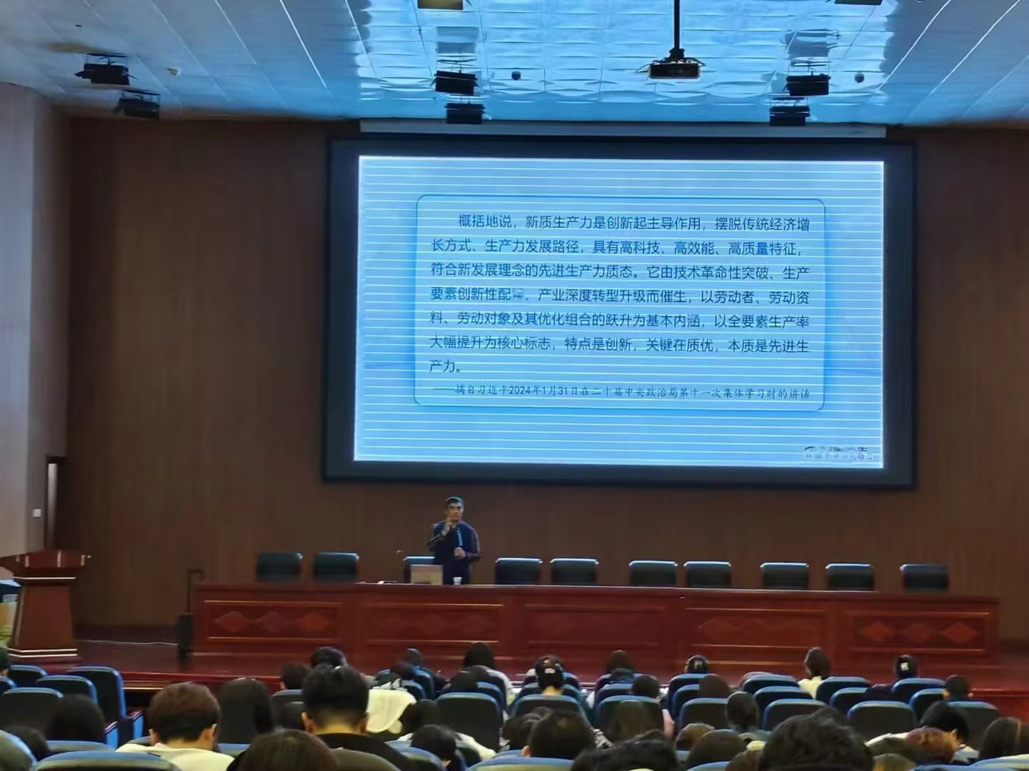 为落实立德树人根本任务,坚持为党育人、为国育才的初心使命,10月30日晚,校党委委员、副校长敖特根深入思政课课堂,在图书馆四楼报告厅为学校300余名师生上了一堂主题为“加快发展新质生产力”的“形势与政策”课。课上,敖特根围绕“事关全局的国之大者”“创新质优的质态特征”“统筹推进的系统工程”三大问题,紧密结合当前世界百年未有之大变局的突出特点,运用丰富的史料、鲜活的案例,语重情深、深入浅出地阐释了什么是...