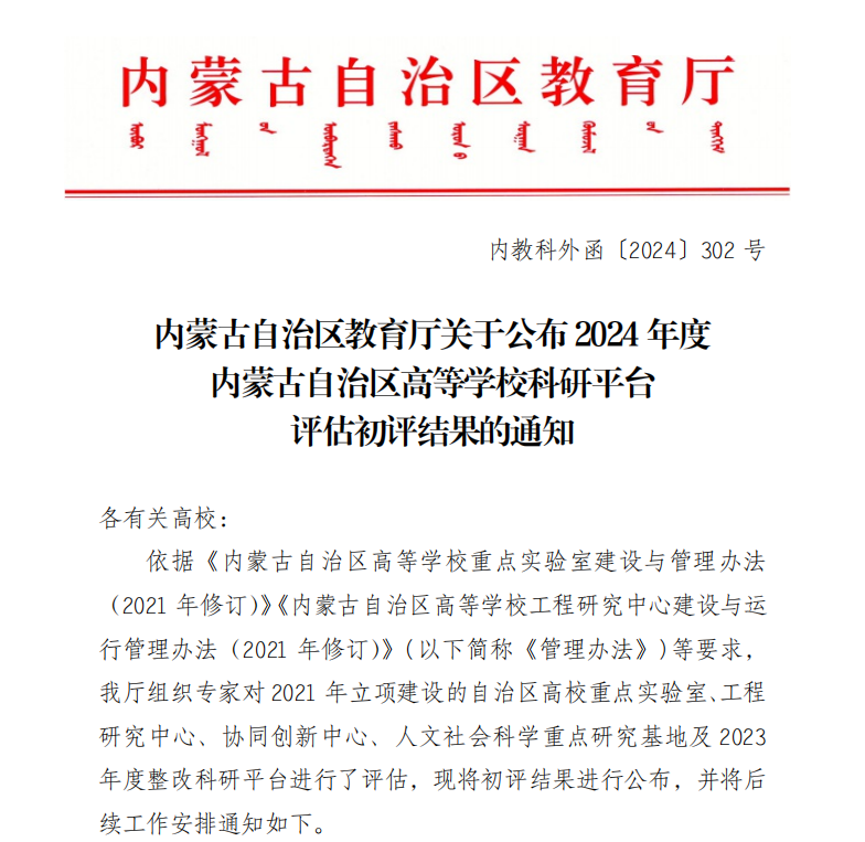 贝博四个省级科研平台通过内蒙古自治区教育厅2024年度评估