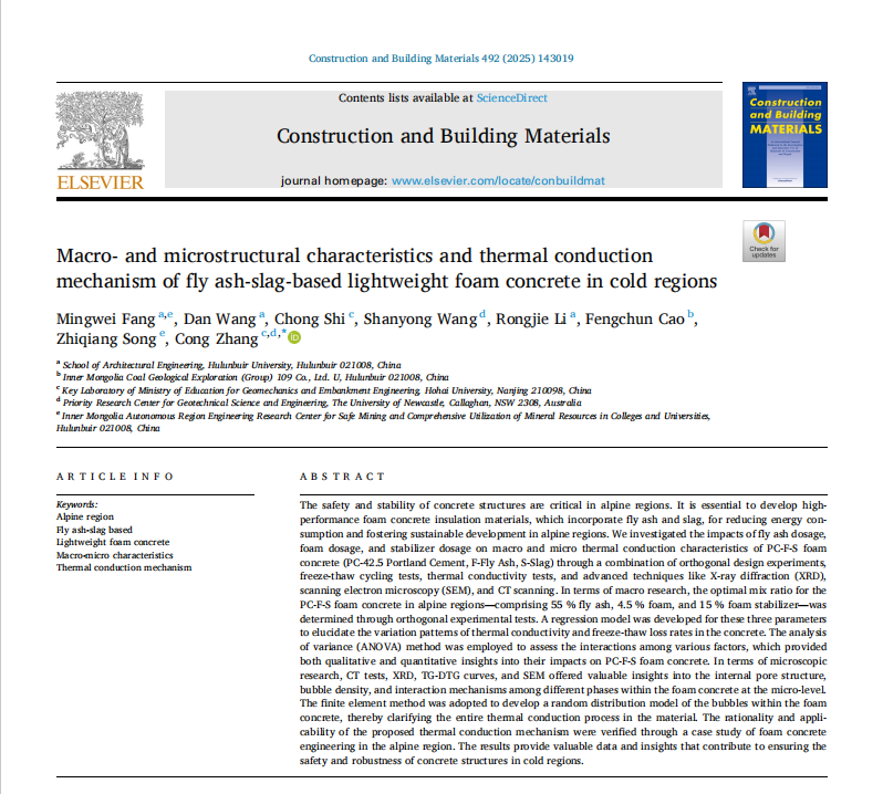 近日,以贝博为第一完成单位、方明伟教授为第一作者的研究成果《高寒区粉煤灰-矿渣基轻质泡沫混凝土宏-微观热传导机理研究》(Macro- and microstructural characteristics and thermal conduction mechanism of fly ash-slag-based lightweight foam concrete in cold regions)发表于工程技术领域一区Top期刊《Construction and Building Materials》(影响因子8.0)。该研究获内蒙古自治区重点研发计划与科技成果转化项目(2...